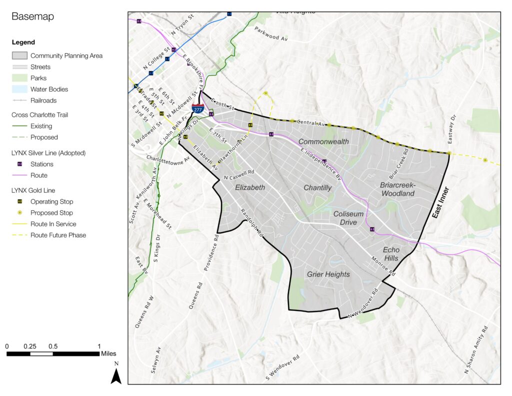 This Community Area Plan (CAP) is one tool to support implementation of the citywide Charlotte Future 2040 Comprehensive Plan and the Charlotte Future 2040 Policy Map, providing more detailed guidance for land use, building form, mobility, open space, and public facilities for the East Inner community-level geography. At this scale, the East Inner CAP provides a coordinated, efficient, and effective structure for identifying nuanced and locally-specific needs and priorities. It also provides a structure for developing strategies and recommendations to address those needs and priorities and for contributing to the community’s overarching goal to create a more equitable Charlotte.