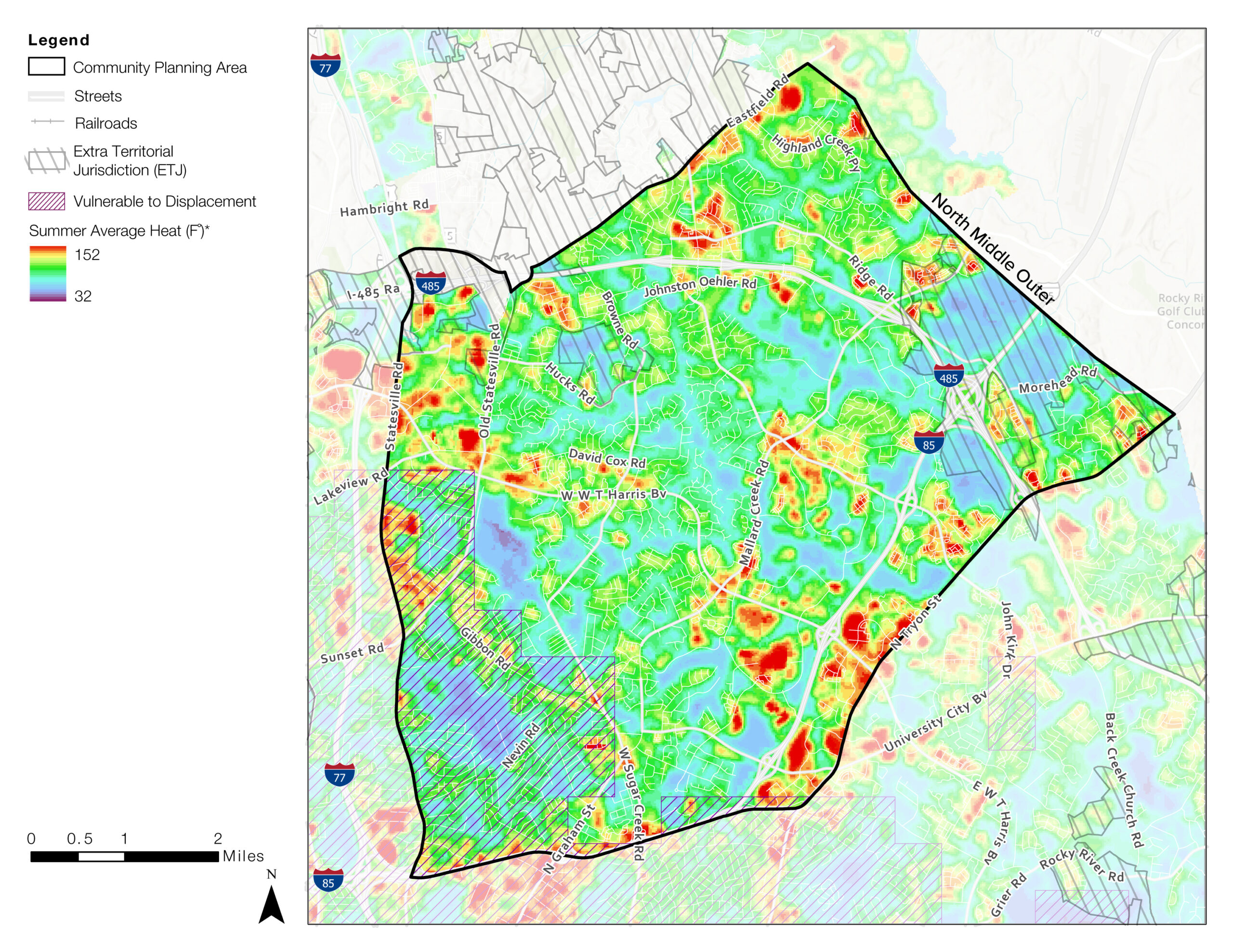 In addition, urban heat land surface temperature was measured within the North Middle & Outer plan area as this new data has become available since the original EJ methodology was developed. This information helps to identify areas exposed to extreme urban heat conditions which may increase community health risks. This information (illustrated in the Urban Heat Map) can be used to inform specific interventions and decisions related to cooling and mitigation measures.