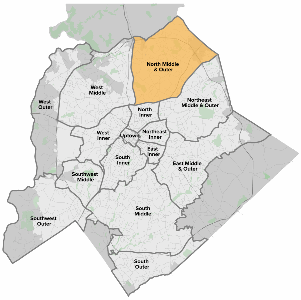 The North Middle & Outer geography is roughly bounded by Eastfield Road to the north, City of Charlotte limits to the east, Tryon Street and Interstate 85 to the south, and Statesville Road to the west. The geography includes several north-south avenues that include high-capacity transit service. Regional-serving streets traverse the area but do not include high-capacity or express transit service throughout the area. The Norfolk Southern Railway bisects the western portion of the geography. The area is primarily auto-oriented with a focus on low-density, single-family residential development. Currently, the area is predominantly characterized by the Neighborhood 1 Place Type with additional concentrations of Campus and Manufacturing & Logistics Place Types. The North Middle & Outer geography is currently home to 103,206 residents (11% of the City’s population) with similar education rates and slightly higher racial and ethnic diversity than the citywide averages. By 2040, this area is expected to grow by 23,438 residential units and 18,605 new jobs (14% and 7% of the city’s total growth, respectively).
