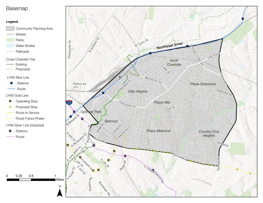 This Community Area Plan (CAP) is one tool to support implementation of the citywide Charlotte Future 2040 Comprehensive Plan and the Charlotte Future 2040 Policy Map, providing more detailed guidance for land use, building form, mobility, open space, and public facilities for the Northeast Inner community-level geography. At this scale, the Northeast Inner CAP provides a coordinated, efficient, and effective structure for identifying nuanced and locally-specific needs and priorities. It also provides a structure for developing strategies and recommendations to address those needs and priorities and for contributing to the community’s overarching goal to create a more equitable Charlotte.